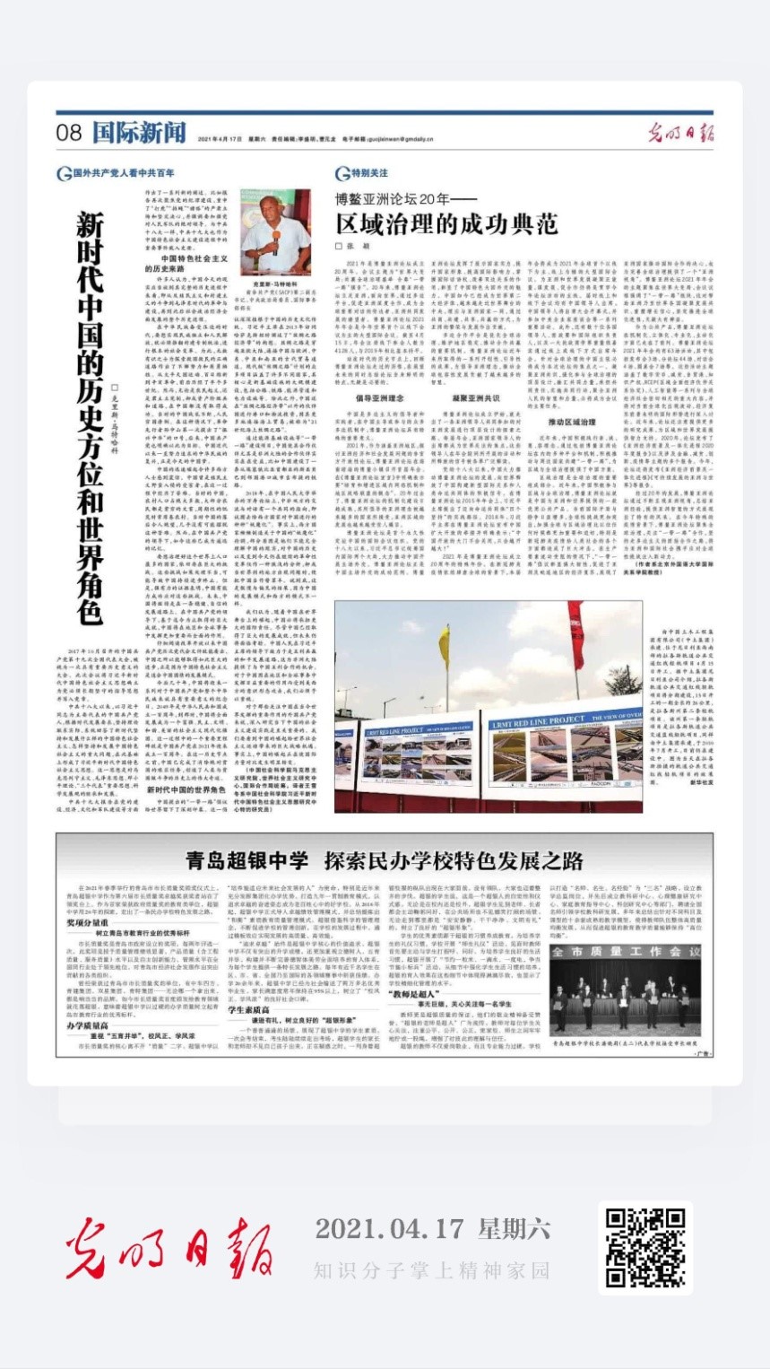 在博鳌亚洲论坛即将召开之际,我校国际关系学院张颖教授在《光明日报》发表署名文章。该文从区域治理的角度解读了博鳌亚洲论坛二十年发展历程,展望了博鳌亚洲论坛未来发展方向。该文是《光明日报》为博鳌亚洲论坛2021年年会预热的系列文章之一,受到广泛关注。