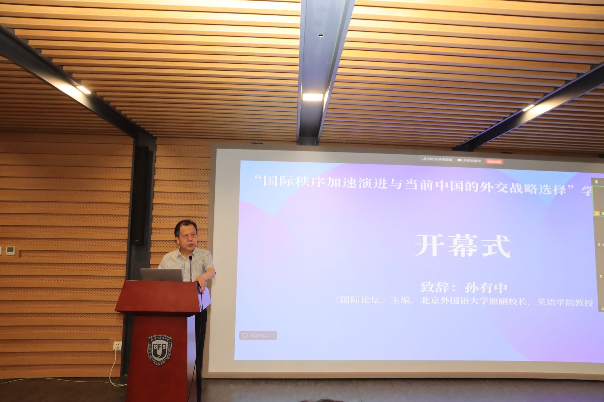 《国际论坛》副主编、北外国际关系学院张志洲教授主持开幕式,并从说明了确定本次研讨会主题的背景和考虑因素。《国际论坛》主编孙有中教授、北外科研处处长张天伟教授在开幕式致辞。孙有中教授指出,在当前世界百年未有之大变局下,国际政治、世界经济、全球文化、新兴科技等各个领域都出现了新态势,同时,今年适逢世界反法西斯战争胜利80周年,召开此次研讨会具有重要的学术价值和现实意义。他还介绍了《国际论坛》近年来的发展和坚持创新理念,开办特色栏目,取得了优异的成绩。他对各位专家学者对《国际论坛》及北外学术事业的支持表示感谢。