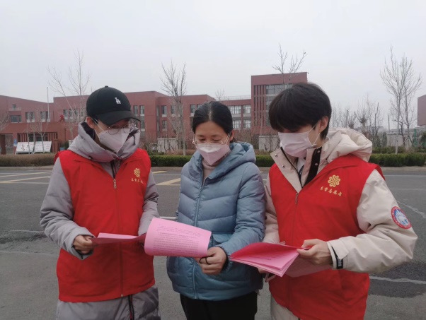 18级王姝懿同学也在社区门口做志愿者。站岗期间,她负责记录出入人员名单,并检查其通行证。其实这项工作并不复杂,但若在东北零下二十多度的温度下进行,却是异常艰辛。在站岗期间,恰逢东北地区降雪,她和其他志愿者轮流站岗,休息期间就到旁边的棚子里取暖,但棚子里的温度也是零下,甚至会有雪花飘进来,四周还透着寒风,穿着长到脚踝的羽绒服和雪地靴依然感到很冷。在外站岗,落在衣物上的大雪融化后,眼镜和衣服也都会被打湿。但是大家谁也没有说累,因为我们有一个共同的信念:一定要打赢疫情防控阻击战。