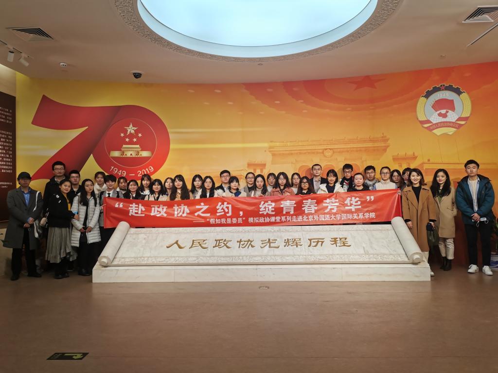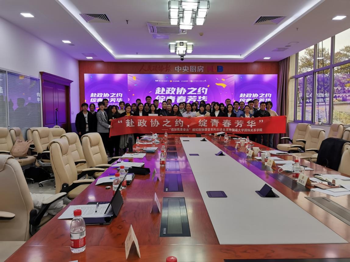 2020年11月18日,首届“模拟政协课堂走进北京外国语大学活动”在北京举行。人民政协是是中国共产党领导各民主党派、无党派人士、人民团体和各族各界人士在政治制度上进行的伟大创造。70年来,在中国共产党的领导下,人民政协坚持团结和民主两大主题,服务党和国家中心任务,在新中国的各个历史时期都发挥了十分重要的作用。通过此次活动,国关学子收获颇深,不仅深化了对政协职能的理解,同时也对自身如何更好地服务国家和社会有了进一步的思考。