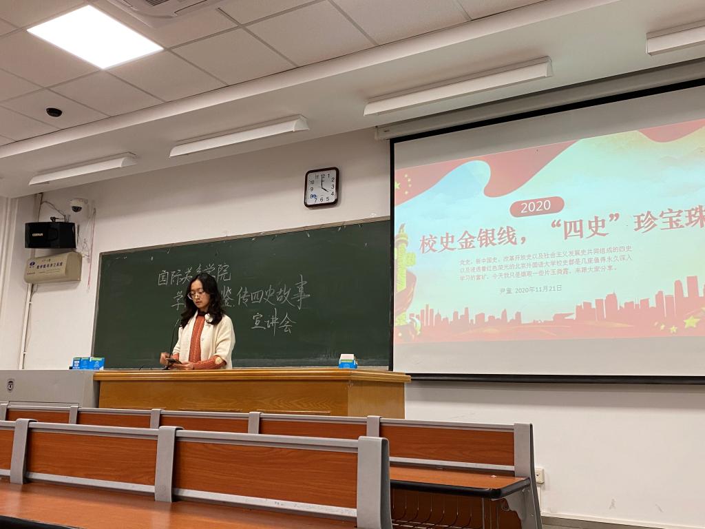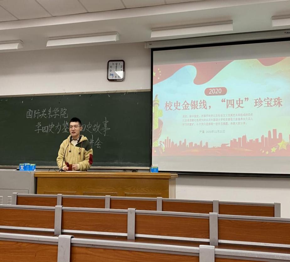 为响应学校号召,以史鉴今、资政育人,国际关系学院团总支于2020年11月21日晚16:00至17:30在逸夫楼116举办了以“学四史为鉴,传四史故事“为题的学生宣讲会。