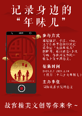 2021年2月,为丰富国关学子的寒假生活、鼓励同学们去挖掘节日中的传统文化,国际关系学院团总支举办了“寻找身边的年味儿”活动。