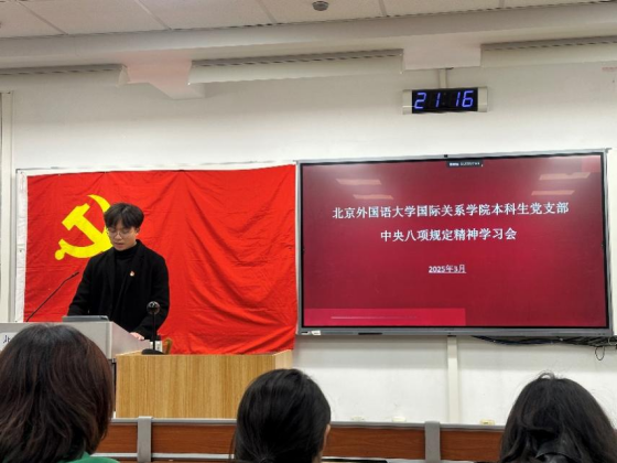 2025年3月25日下午,北京外国语大学国际关系学院本科生党支部理论学习活动在逸夫楼402顺利举行。本期理论学习由本科生党支部书记孙至善主讲,围绕“中央八项规定精神的内涵与实践要求”展开专题讲解。