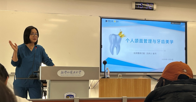 2025年12月3日,由国际关系学院举办、北京爱齿口腔门诊创始人崔月医生主讲的“明眸皓齿,笑靥流芳”口腔及牙齿美学讲座在逸夫楼410教室成功举行。通过本次美育活动,同学们对牙齿维护与面部美学的认识大大提高,更加重视牙齿和颜面维护对提升个人形象与自信程度的作用。