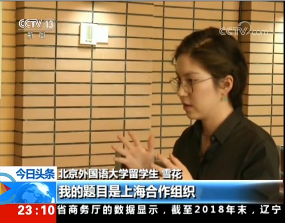 为配合中国国家主席习近平访问中亚并出席上海合作组织领导人峰会,中央广播电视总台新闻频道在6月12日晚11点整点新闻《今日头条》中播出了2019年上合峰会特别报道节目,主题为“多样化的人文交流有助民心相通”。节目中专门采访了北京外国语大学国际关系学院2015级吉尔吉斯斯坦留学生阿扎特和雪花兄妹。采访结合两位同学的本科毕业论文答辩,展现了二人希望用在中国所学服务于中吉合作的愿望。