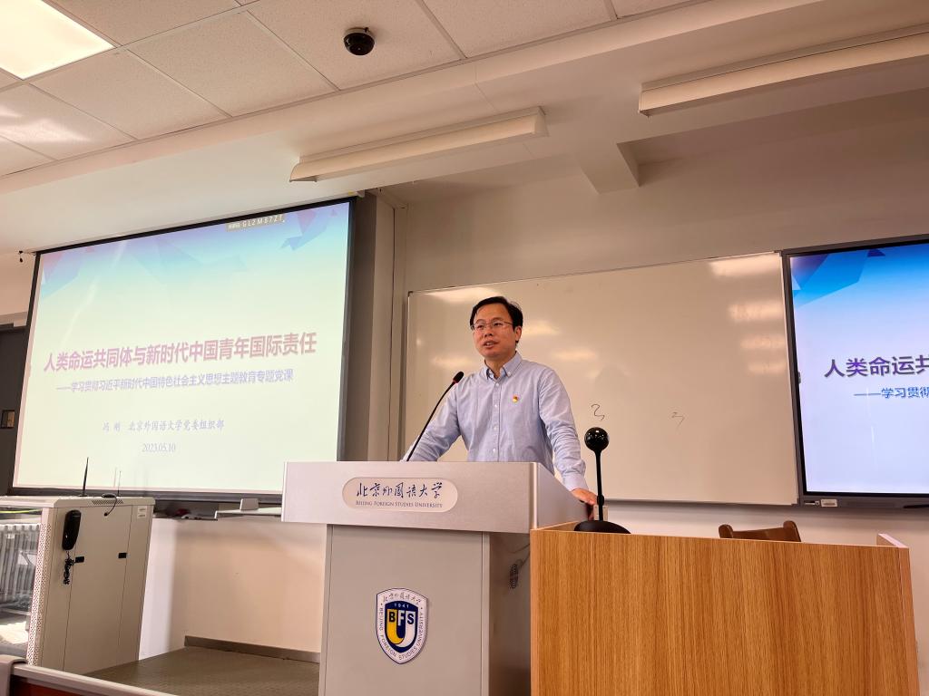 5月10日,北京外国语大学国际关系学院党总支邀请学校党委组织部常务副部长冯刚作题为《人类命运共同体与新时代中国青年国际责任---学习贯彻习近平新时代中国特色社会主义思想主题教育》的专题报告。国际关系学院党总支书记张效民主持报告会,党总支副书记彭澍、副院长张颖、辅导员钱梦婷等约70名师生出席本次专题党课。