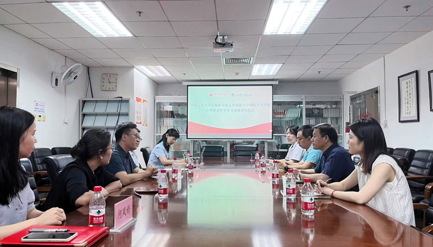 2024年7月4日,北京外国语大学国际关系学院走访中国人民大学出版社,双方就合作事宜进行座谈交流,并签订合作建设学生实习基地协议。
